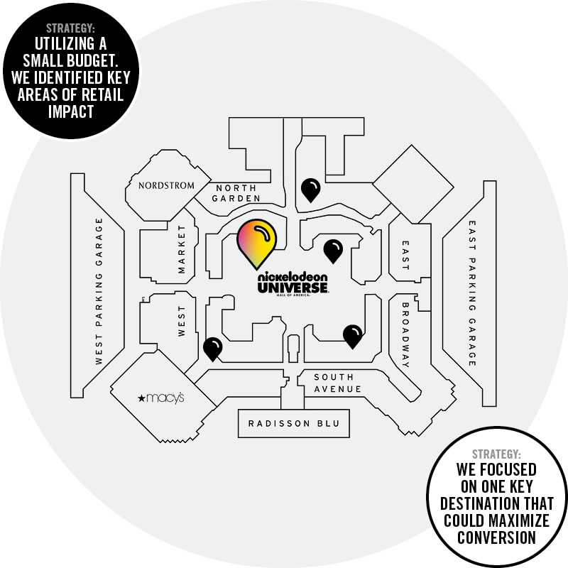 SPONGEBOB WAS CELEBRATING 25 YEARS UNDER THE SEA - AT THE MALL OF AMERICA. WE USED A SMALL BUDGET TO STRATEGICALLY DRIVE SEASONAL RETAIL PURCHASES TO KEY RETAIL HOT SPOTS WITHIN THE MALL.