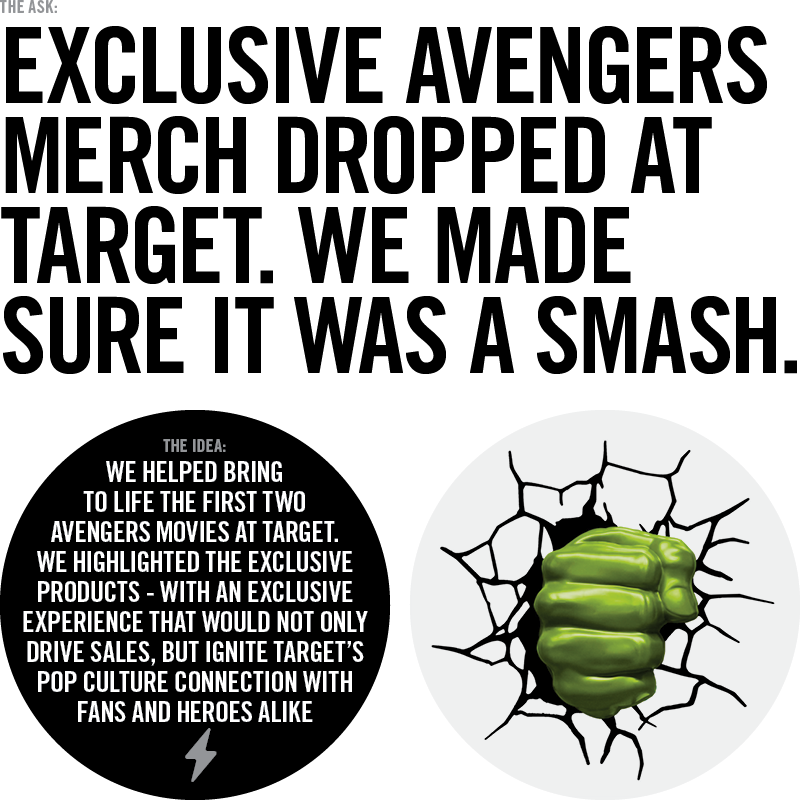 AVENGERS & TARGET TEAMED UP WITH EXCLUSIVE MERCHANDISE FOR THE RELEASE OF MARVEL’S FIRST 2 MOVIES IN THE FRANCHISE. WE CREATED EXCLUSIVE EXPERIENCES YOU COULD ONLY FIND IN THE AISLES OF TARGET.