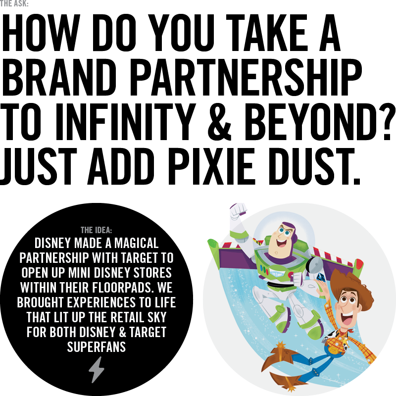 DISNEY PARTNERED WITH TARGET TO CREATE A HUB OF MAGIC AND WONDER WITHIN TARGET STORES. WE CREATED A STRATEGIC JOURNEY OF EXPERIENCES THAT LED GUESTS THROUGH THE SPACE.